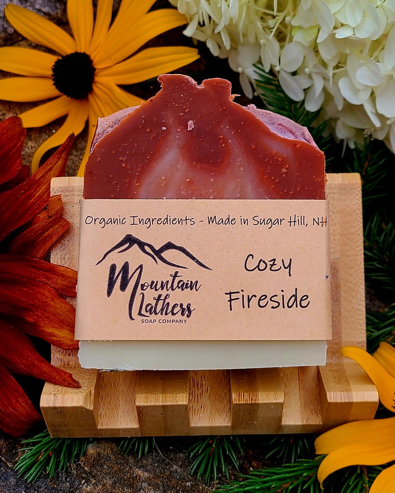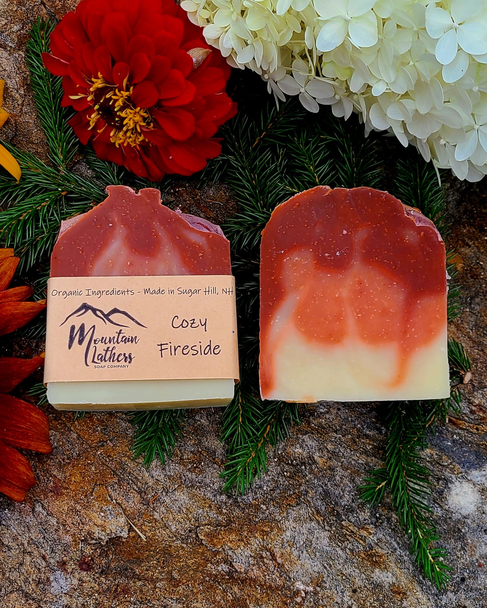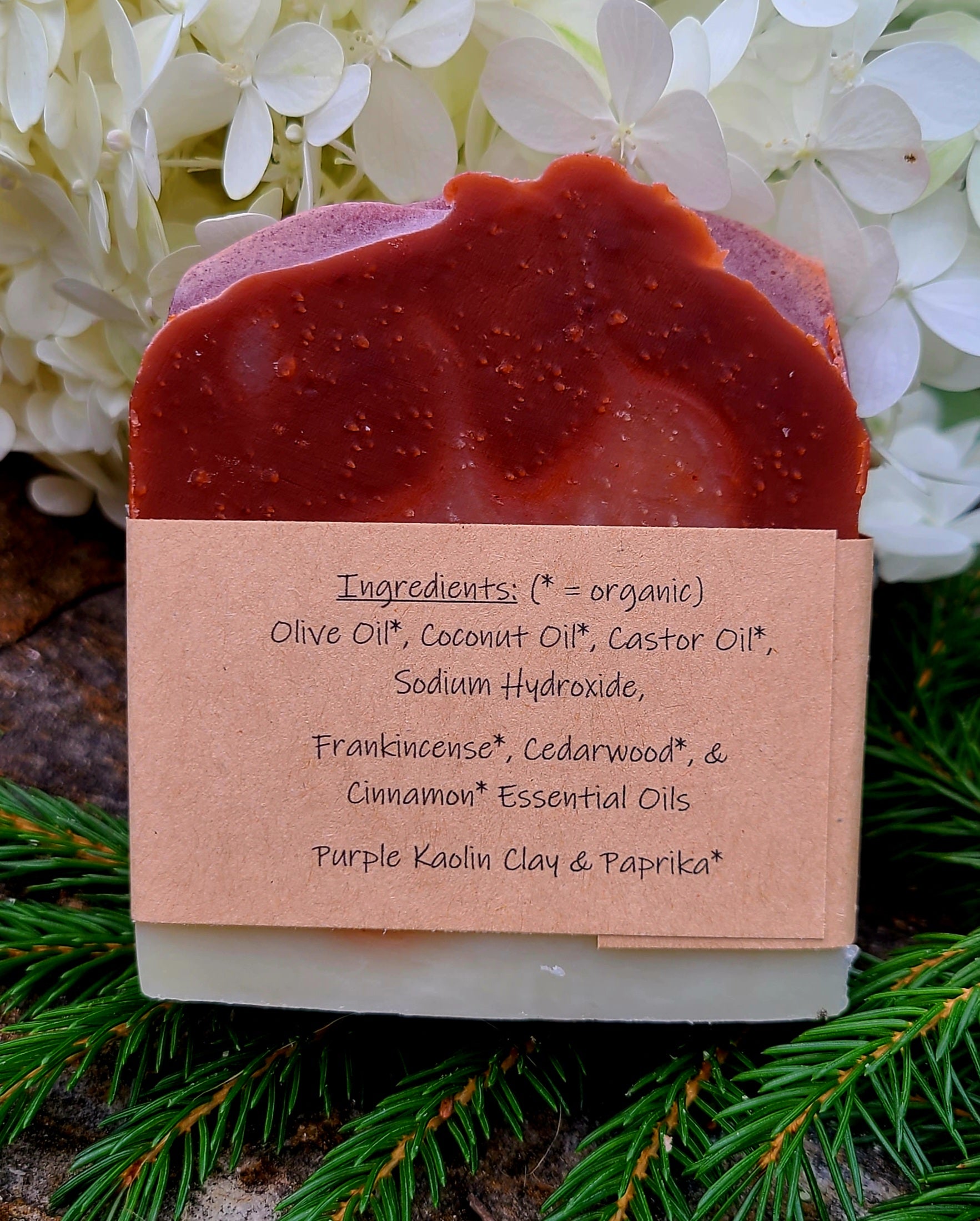 Cozy Fireside: Scented with Frankincense*, Cedarwood*, & Cinnamon* essential oils. Contains Purple Kaolin Clay, & Paprika*.