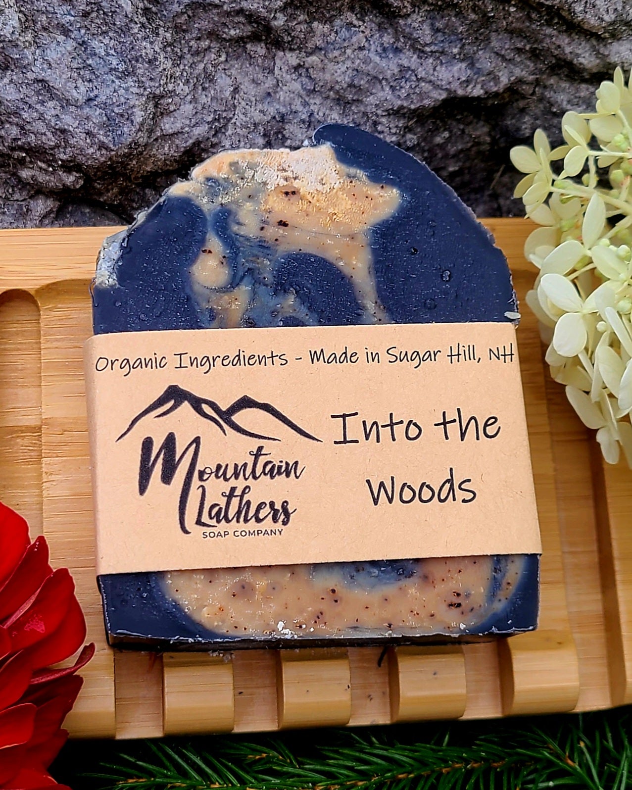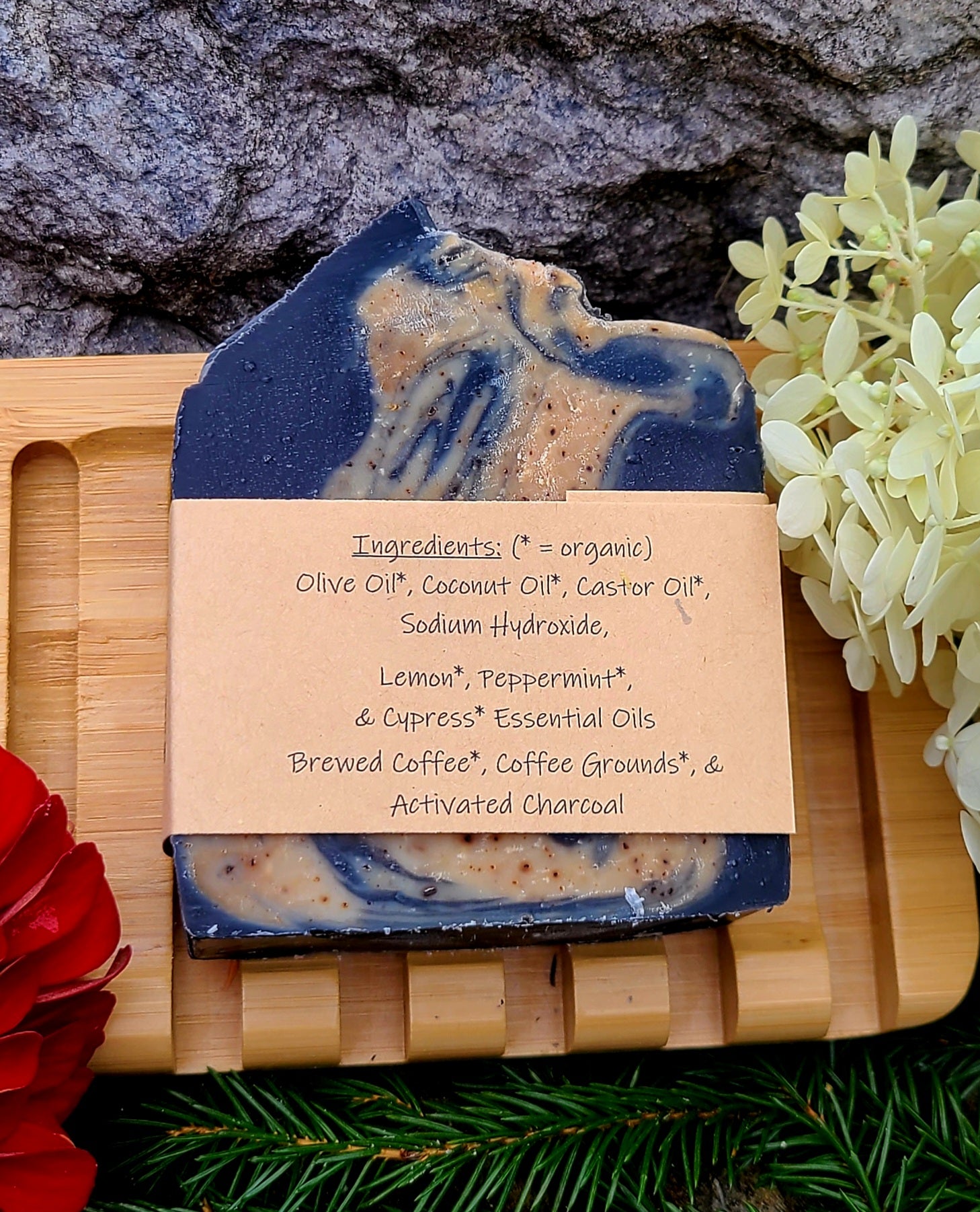 Into the Woods: cypress*, peppermint*, & lavender* EO's with activated charcoal, brewed coffee*, & coffee grounds*