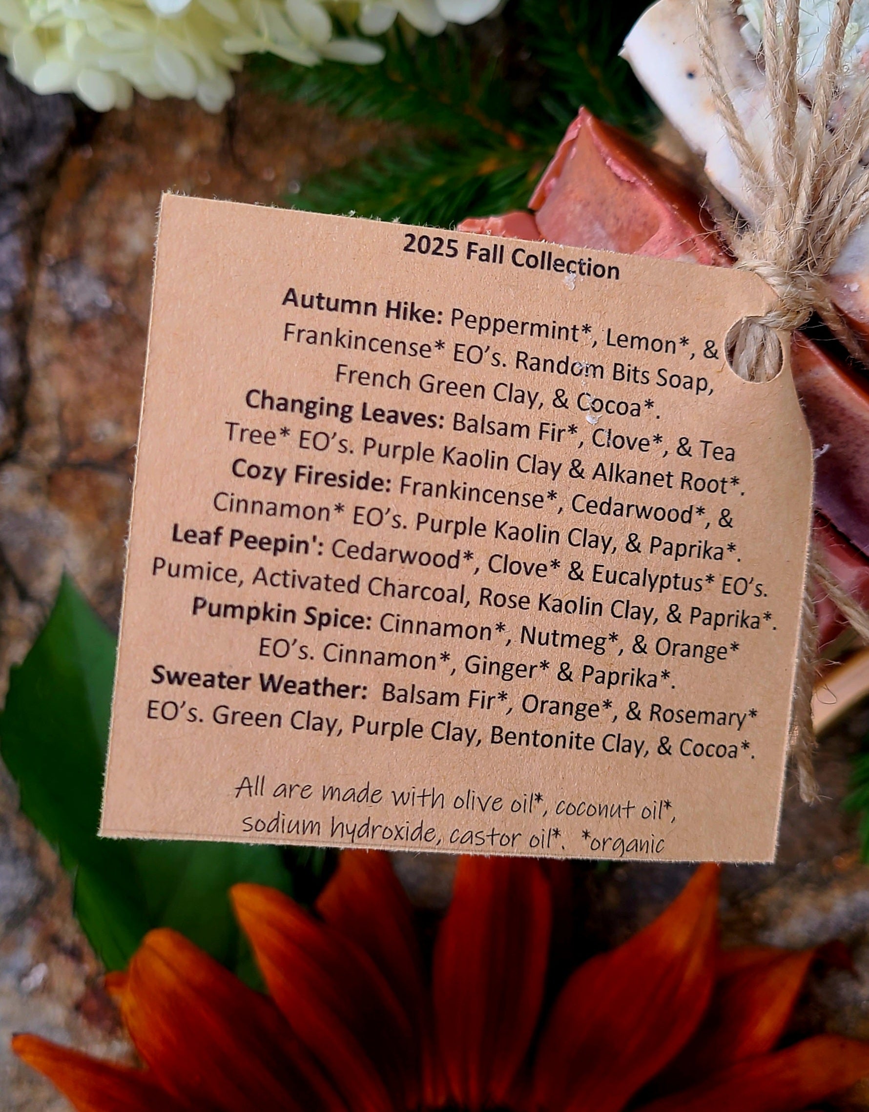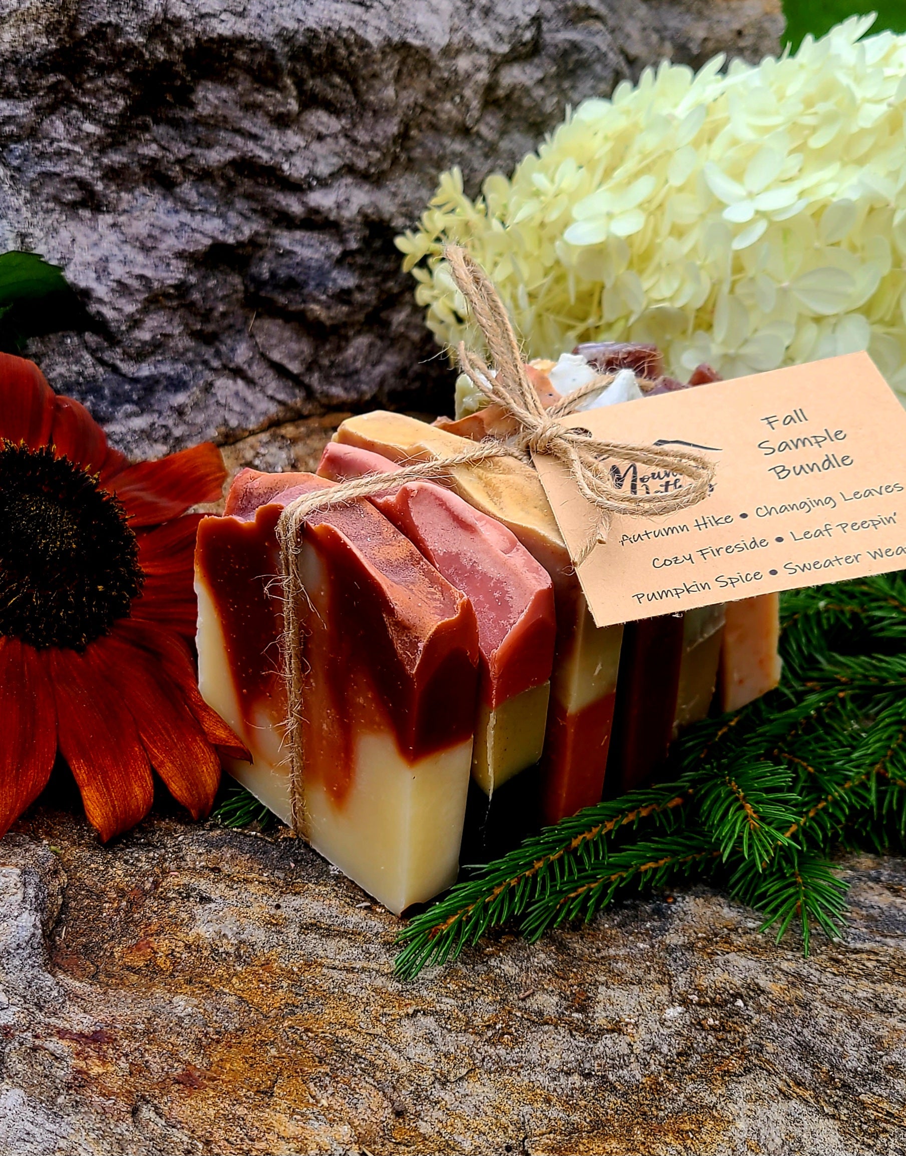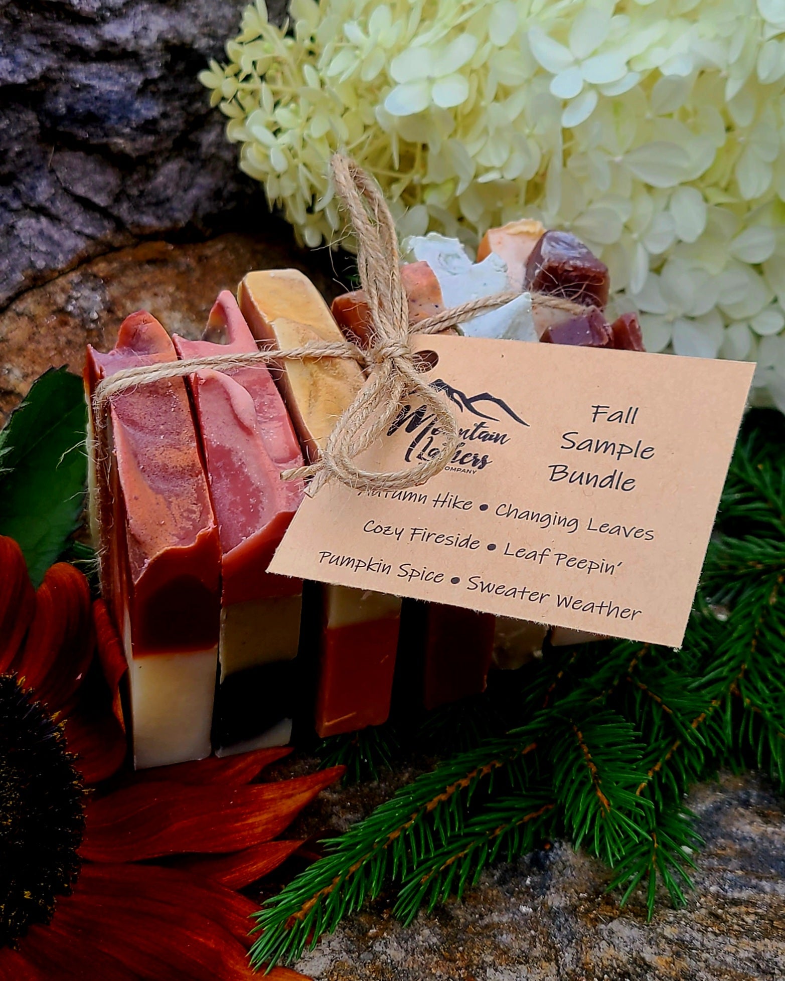 This sample pack contains a half-sized bar of the 6 limited time Fall Collection soap bars: Pumpkin Spice, Autumn Hike, Sweater Weather, Changing Leaves, Cozy Fireside, & Leaf Peepin'.