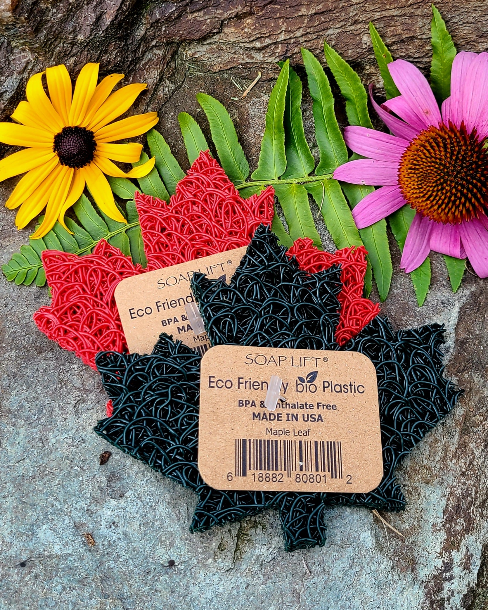 The Soap Lift® is made with corn based bioplastic and comes wrapped in a recycled craft paper.