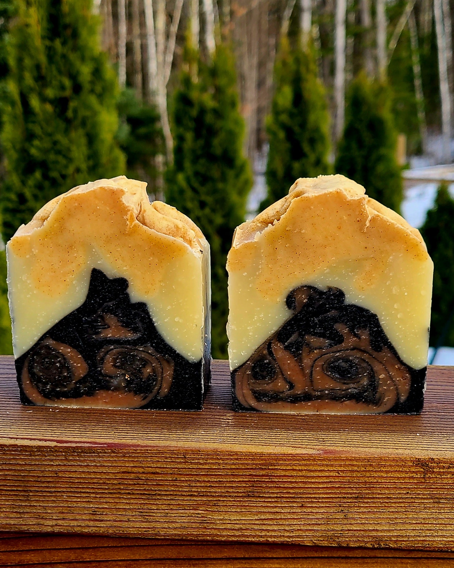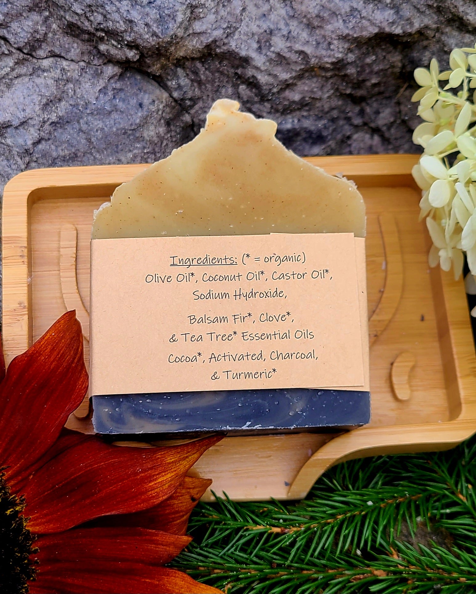 Summit View: balsam fir*, clove*, & tea tree* EO's with cocoa*, turmeric, and activated charcoal.