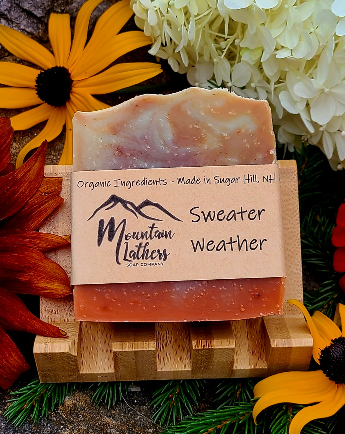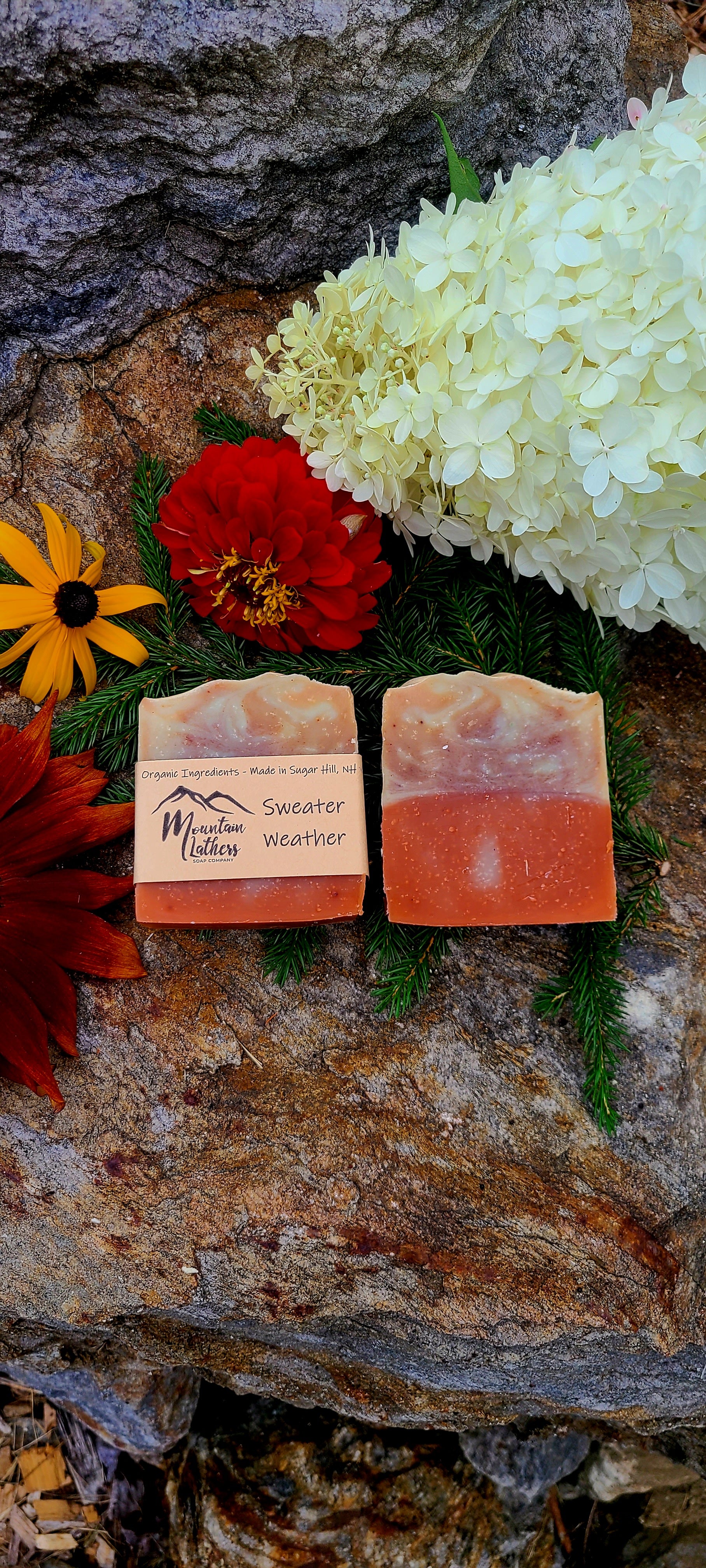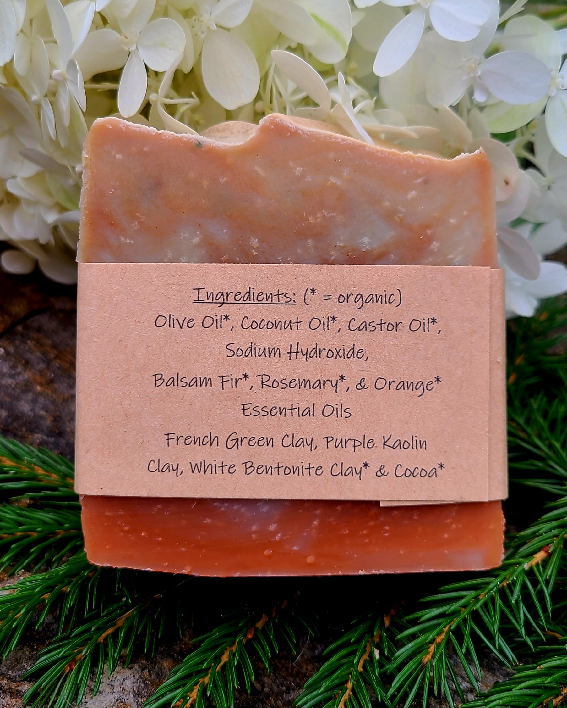 Sweater Weather: Scented with Balsam Fir*, Orange*, & Rosemary* essential oils. Contains French Green Clay, Purple Kaolin Clay, White Bentonite Clay &, Cocoa.